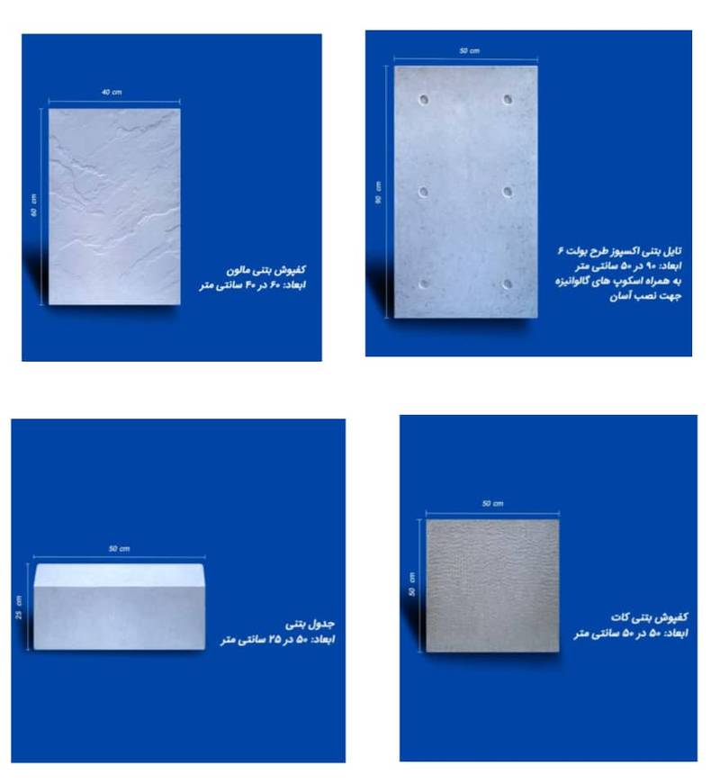 تولید و فروش انواع صنایع بتنی از قبیل موزاییک پلیمری، انواع کف پوش های بتنی، موزاییک حیاطی، تایل بتن اکسپوز، موزاییک بتنی پلیمری، سنگ تراورتن، تایلهای بتن اکسپوز طرح چوبی، بتن اکسپوز سیمانی، کفپوش و دیوار پوش طرح کیوبیک، دیوار پوش بتن اکسپوز طرح موج، کفپوش بتنی طرح پولک، کفپوش بتنی دورقاب چرمی با کیفیت بالا و نازل ترین قیمت در خدمت مشتریان عزیز در کل کشور میباشد.